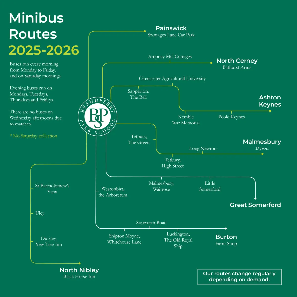 The School offers private bus transportation from Dursley, Uley, North Cerney, South Cerney, Ampney Crucis, Kemble, Painswick, Cirencester, Tetbury, Malmesbury, Grittleton, Sherston, Shipton Moyne, Great Somerford and villages in between. These routes change yearly depending on demand.
